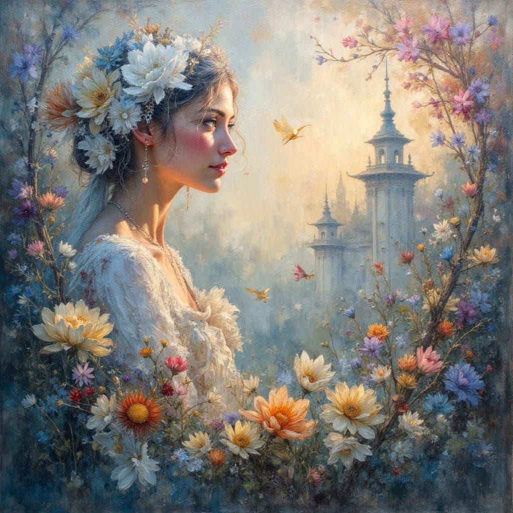 A vibrant and textured gouache painting with thick brush strokes and layers of color. The image evokes a museum-quality, neo-impressionist style with elements of fantasy and hyperdetail.