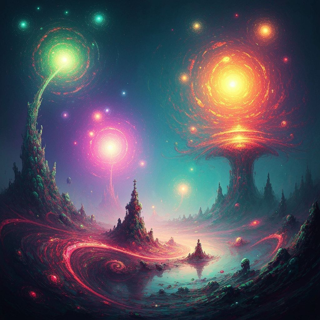 This image showcases a fantastical, dreamlike scene filled with vibrant, swirling colors and complex patterns, created with digital painting and concept art techniques.