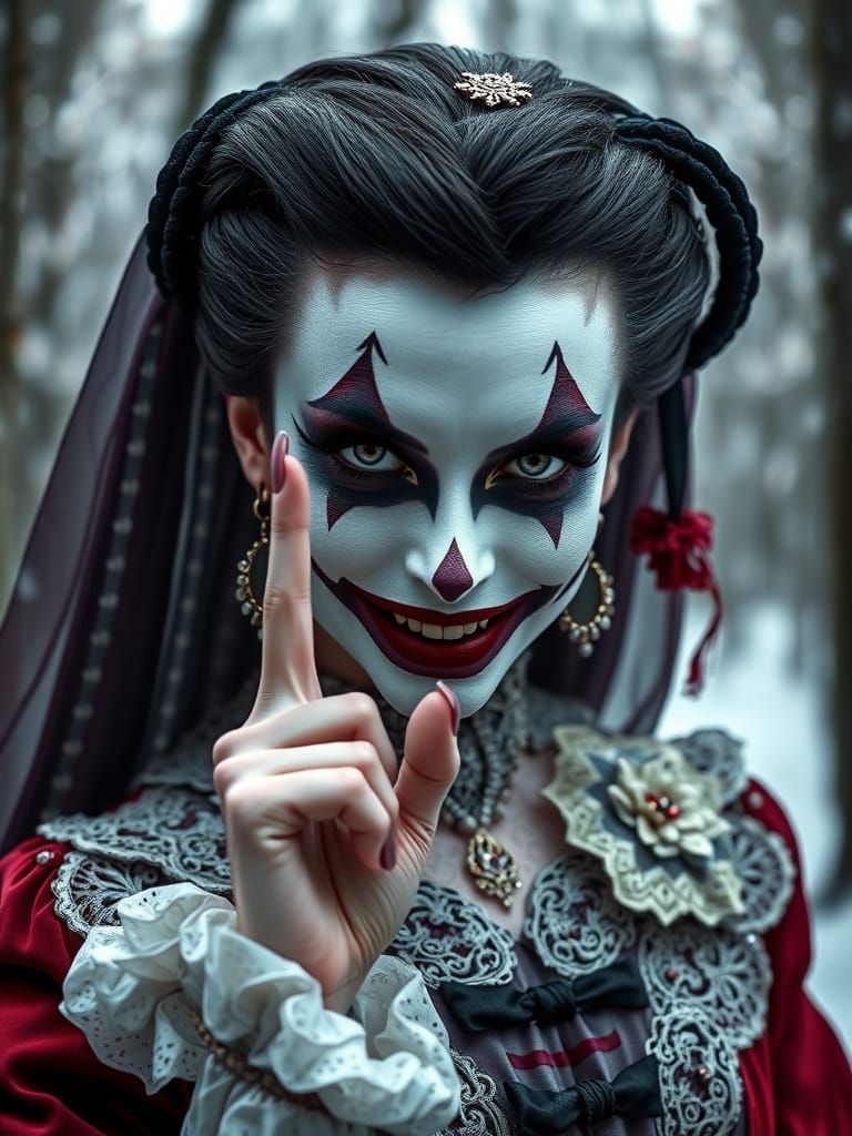 This image shows a harlequin woman in Victorian attire gesturing for silence. Set against a snowy forest, the hyperrealistic image with high contrast evokes a cinematic and slightly sinister mood.