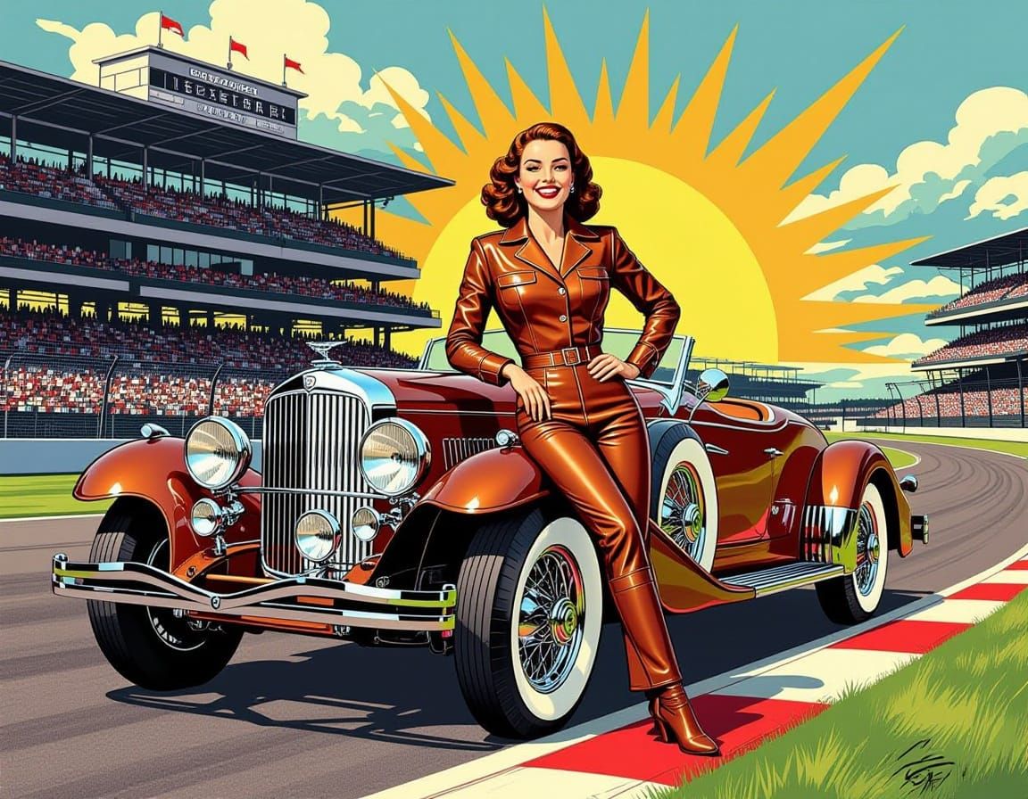 This image depicts a smiling woman in a vintage racing suit leaning on a classic Duesenberg car at Indianapolis Motor Speedway. Rendered in a bold comic book style with vibrant colors.
