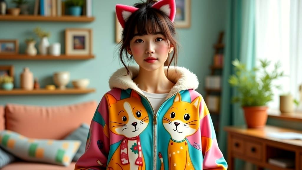 This image is a hyperrealistic portrait of a woman wearing a futuristic cat-hoodie sweater, blending photorealism with a touch of whimsy and modern style.