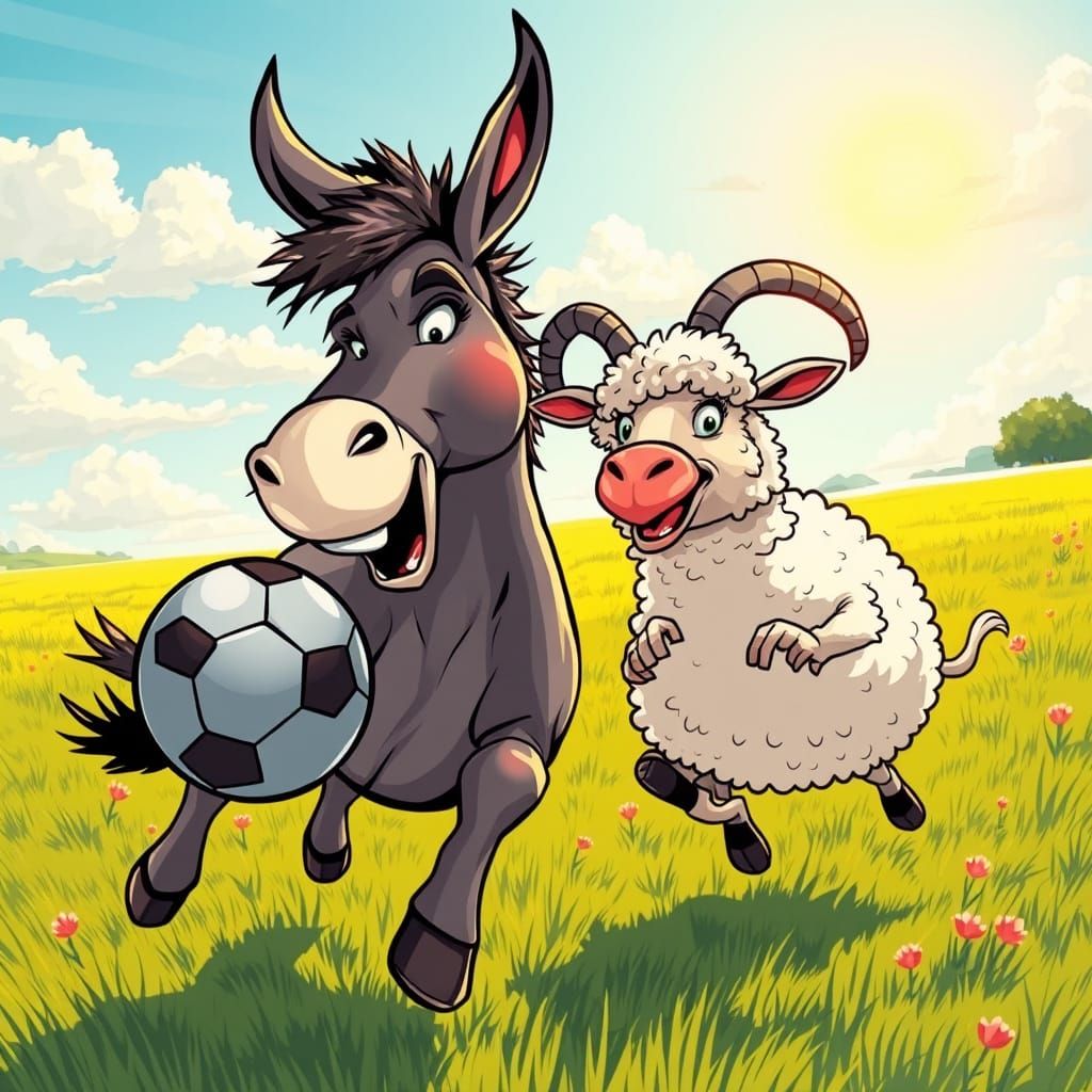 A vibrant illustration of a donkey and sheep joyfully playing football in a sunlit field, rendered in a bold comic book style with saturated colors and dynamic lines.