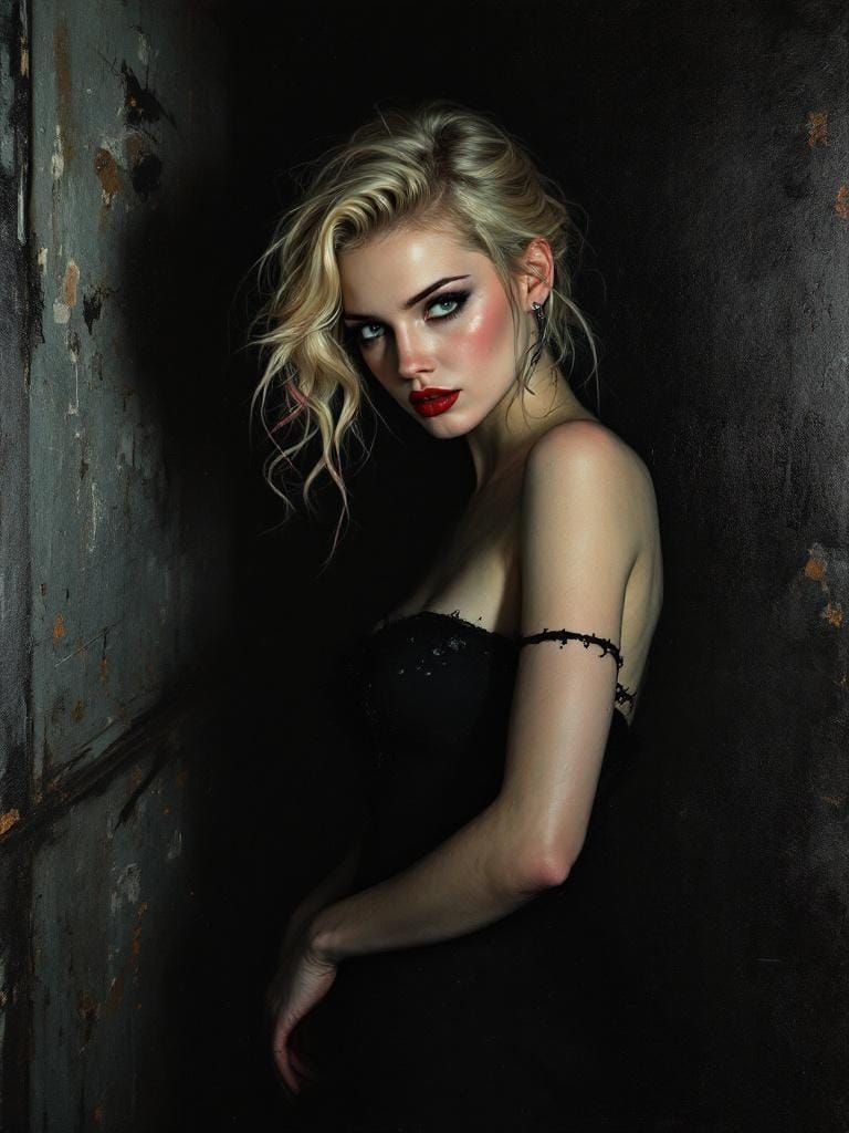This image shows a pin-up woman with pink-tipped hair making direct eye contact. The image is rendered with dramatic lighting and thick impasto paint, conveying emotional depth in a film noir aesthetic.