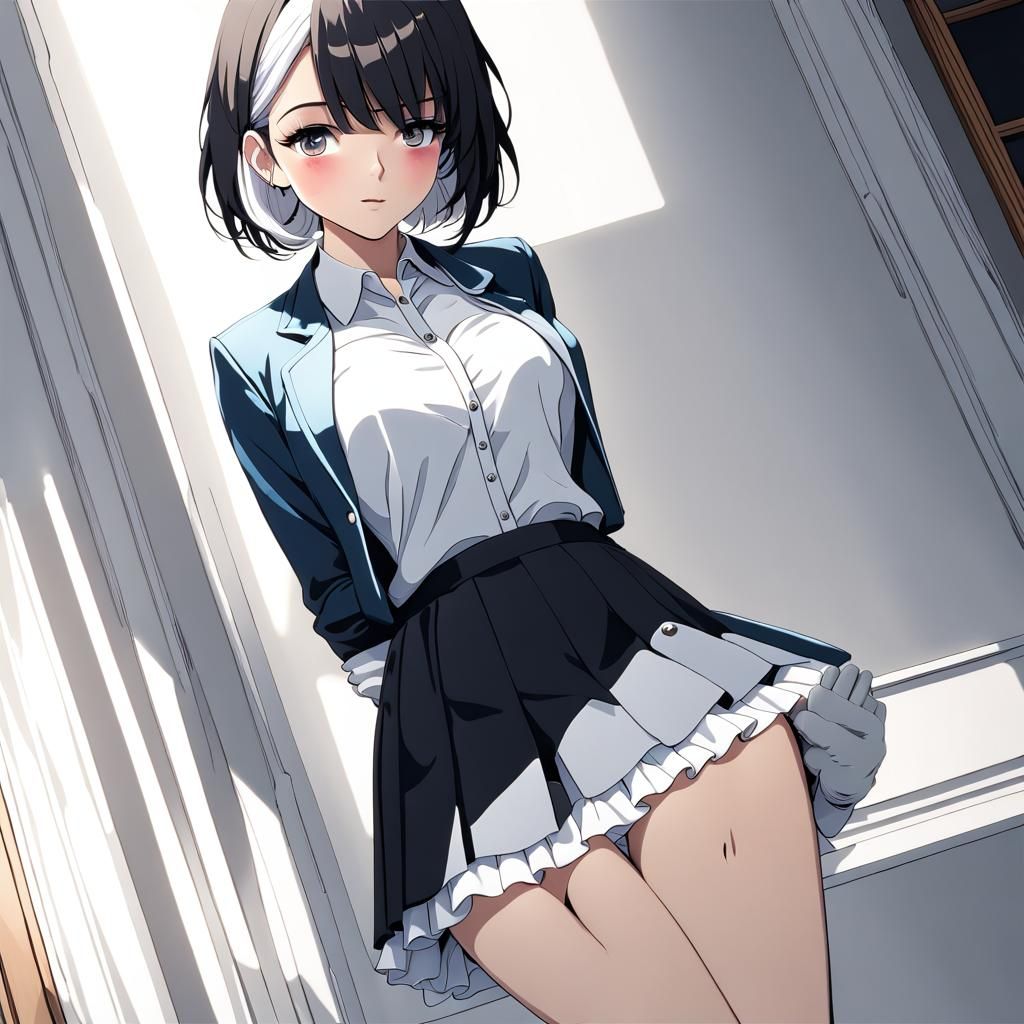 This image shows a woman with striking two-tone hair in a pleated skirt. The digital art is cel-shaded, highlighting the details of her outfit and unique hairstyle.