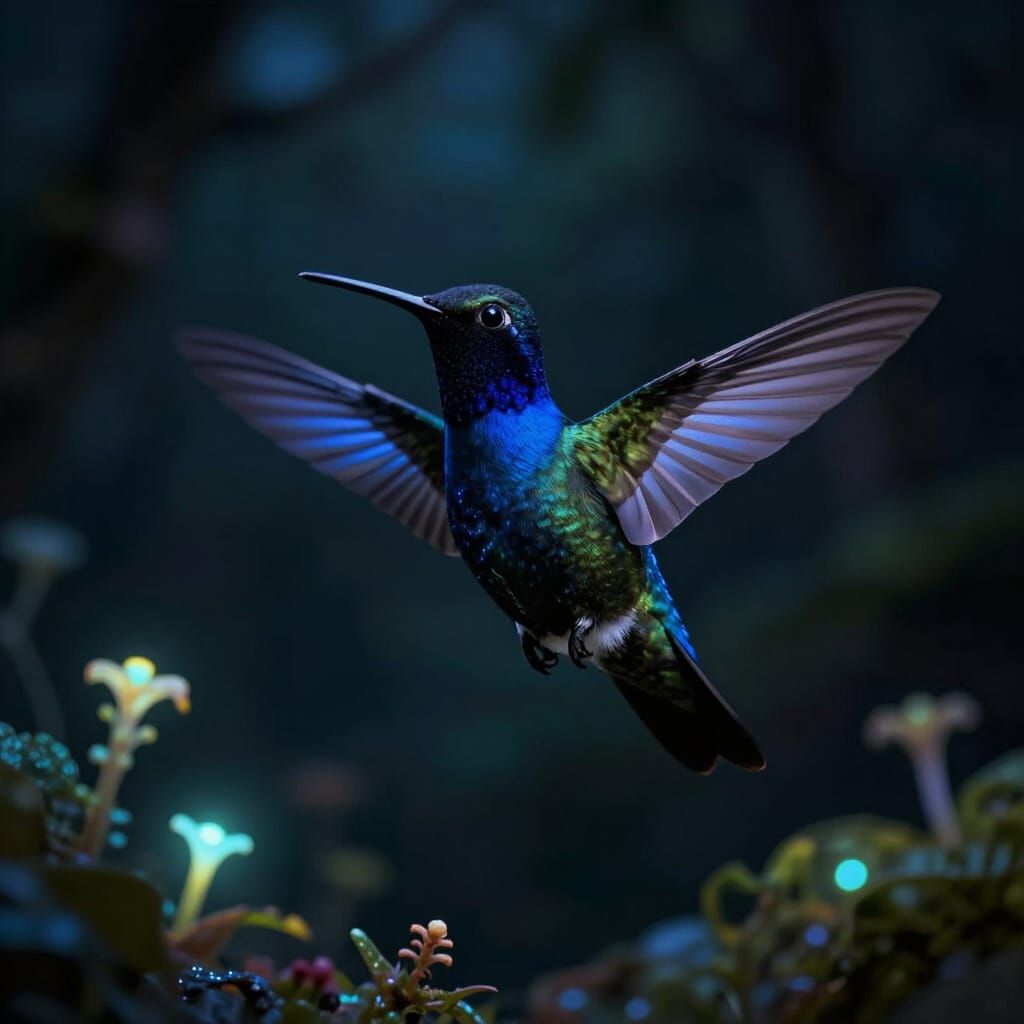 This image shows a photorealistic hummingbird with glowing blue wings in a dark forest. Bioluminescent plants provide an ethereal glow, creating a cinematic and detailed scene.