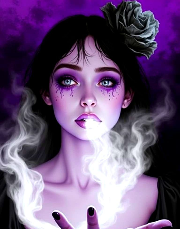 This image shows a woman with translucent purple skin drawing life essence through smoke. The artwork features surreal, melting elements with dark fantasy undertones and dynamic lighting.