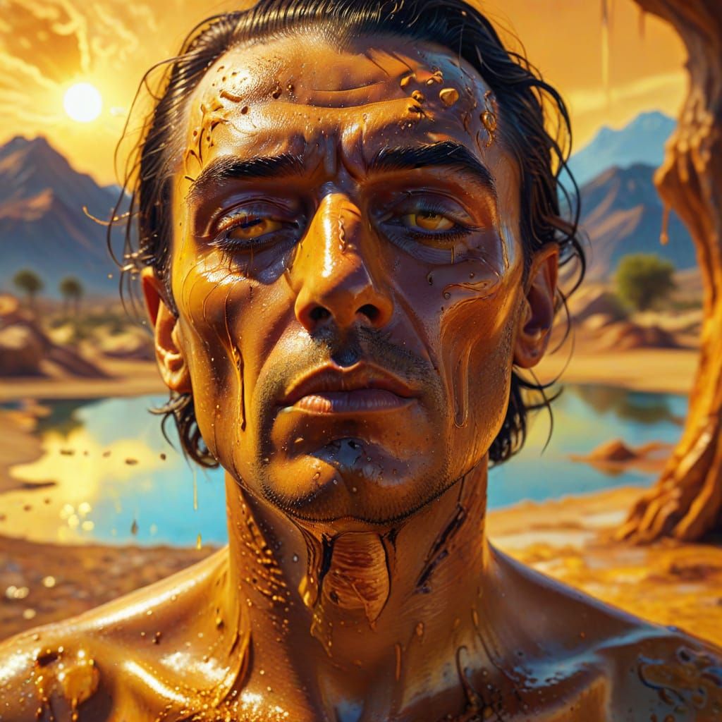 This image shows a person sweating in extreme summer heat, depicted as a surrealist oil painting. The artwork features warm golden light, melting scenery, and shimmering air in a dreamlike style.