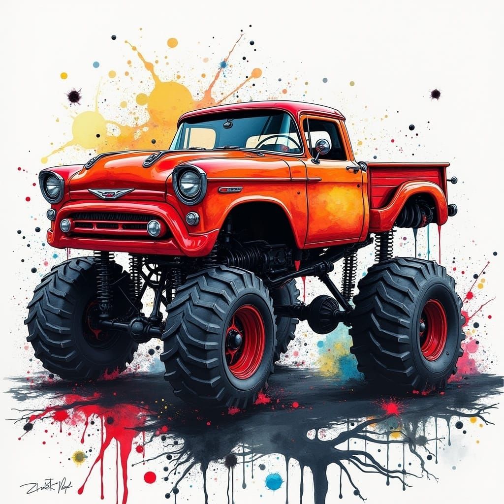 This image shows a stylized 1957 Chevy pickup truck transformed into a monster truck. It features a splashy watercolor effect with intense, chaotic colors, blending surrealism and biomechanical art.