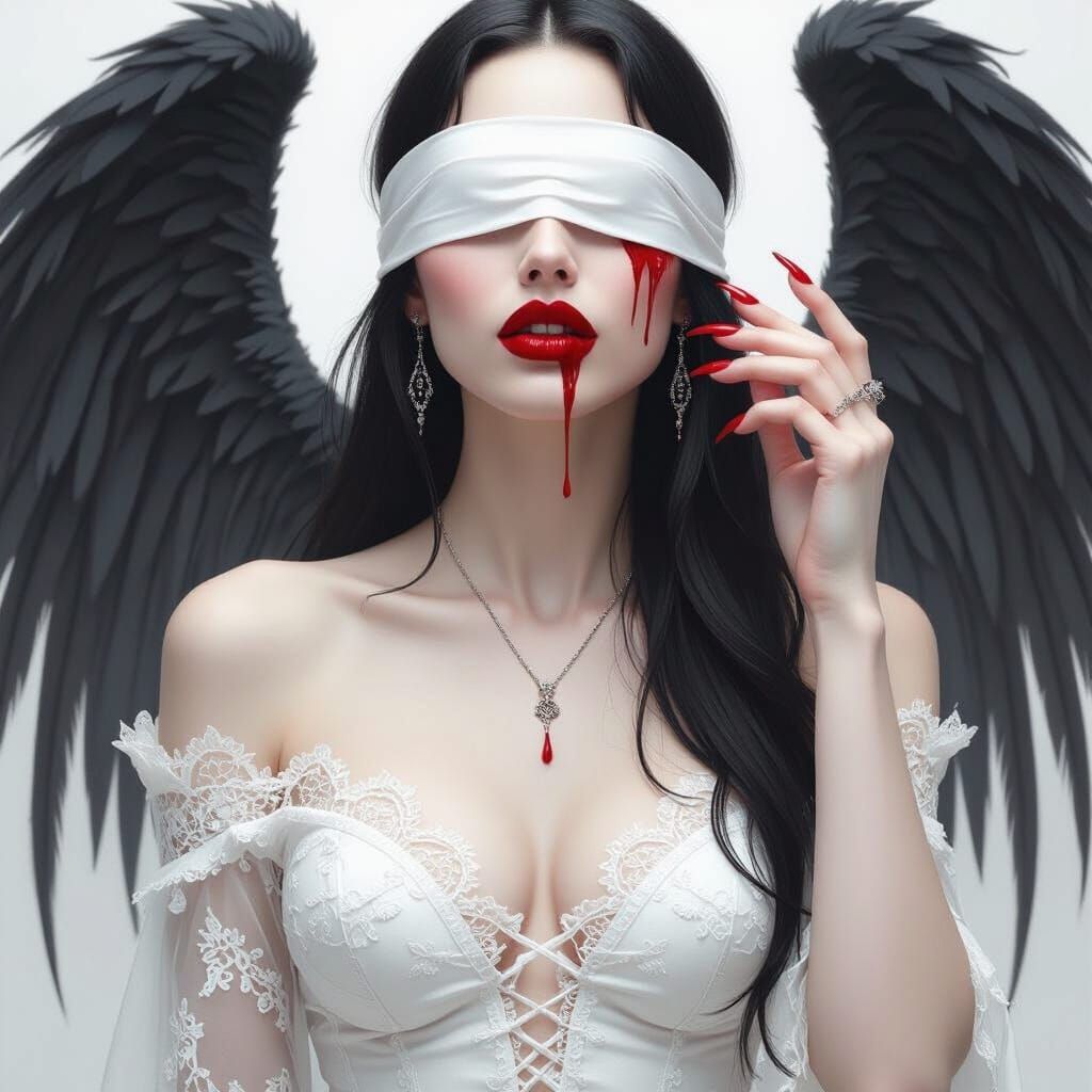This image shows a pale female vampire angel with blood dripping down her face. She's in a white lace dress and blindfold, with red lipstick, sharp fangs, and gothic wings in a dark, mystical aesthetic.