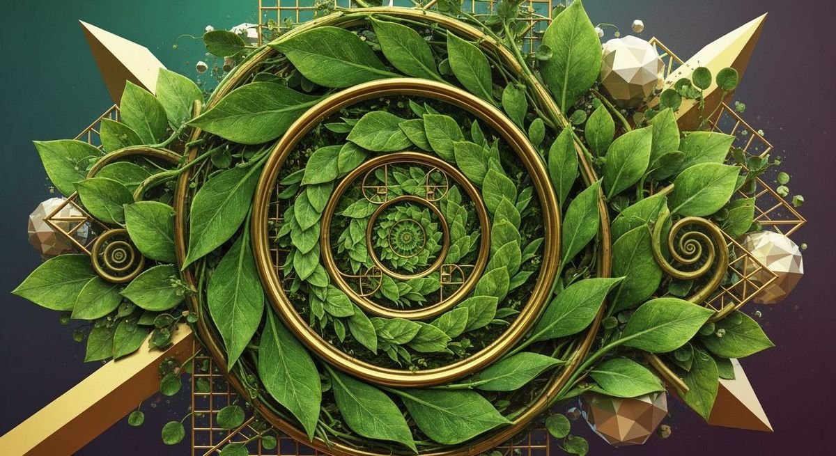 This hyperrealistic concept art showcases botanical geometry, featuring spiraling plant forms and perfect phyllotaxis patterns. Lush greenery meets metallic polygons, balancing nature's logic with human precision.