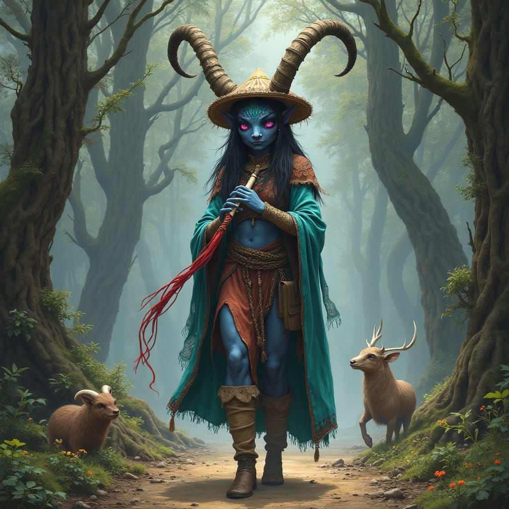 This enchanting image depicts a Xaela female Au Ra surrounded by an ancient forest, playing a melodic tune on a flute as woodland creatures gather around. Her blue skin and obsidian scales shimmer in the soft, atmospheric light, reminiscent of a fantastical world.