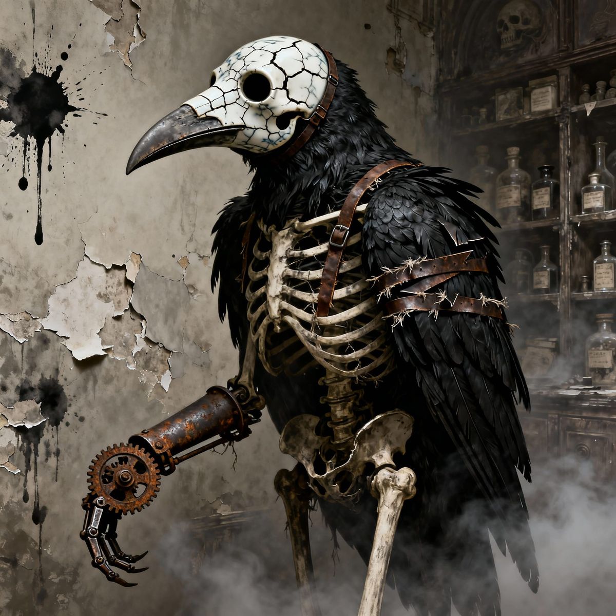 This image shows a detailed dark fantasy digital painting of a raven plague doctor with a cracked mask and iron prosthetic wing. Features moody lighting and a desaturated palette.
