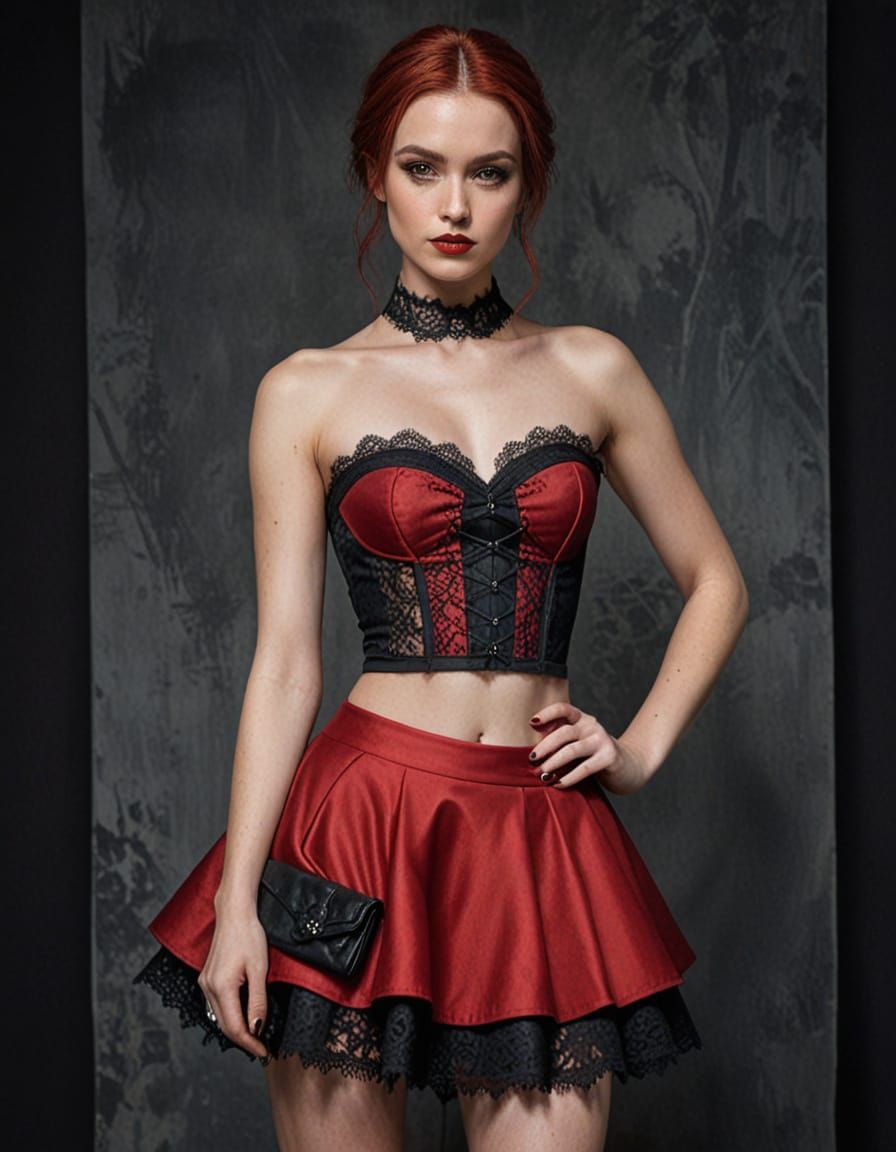 This image shows a redhead waitress in a black and crimson micro skirt and lace bustier. This hyperrealistic portrait features a high level of detail and an asymmetrical skirt design.