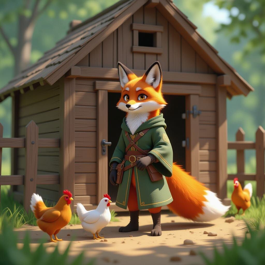 A noble fox faithfully guards a hen house, rendered in a highly detailed 3D anime art style with breathtaking clarity and aesthetic appeal.