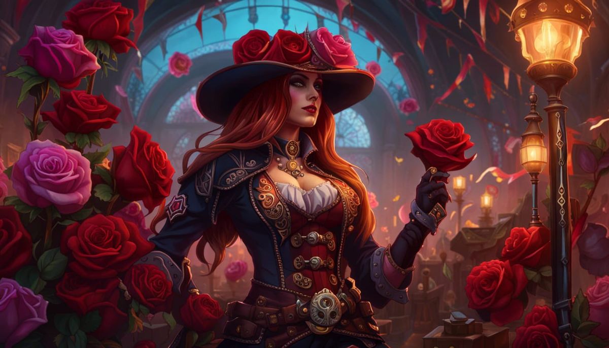 This image shows Katarina Calavera at a carnival with roses and steampunk elements, rendered in vibrant colors. The artwork features dynamic and volumetric lighting with intricate details.