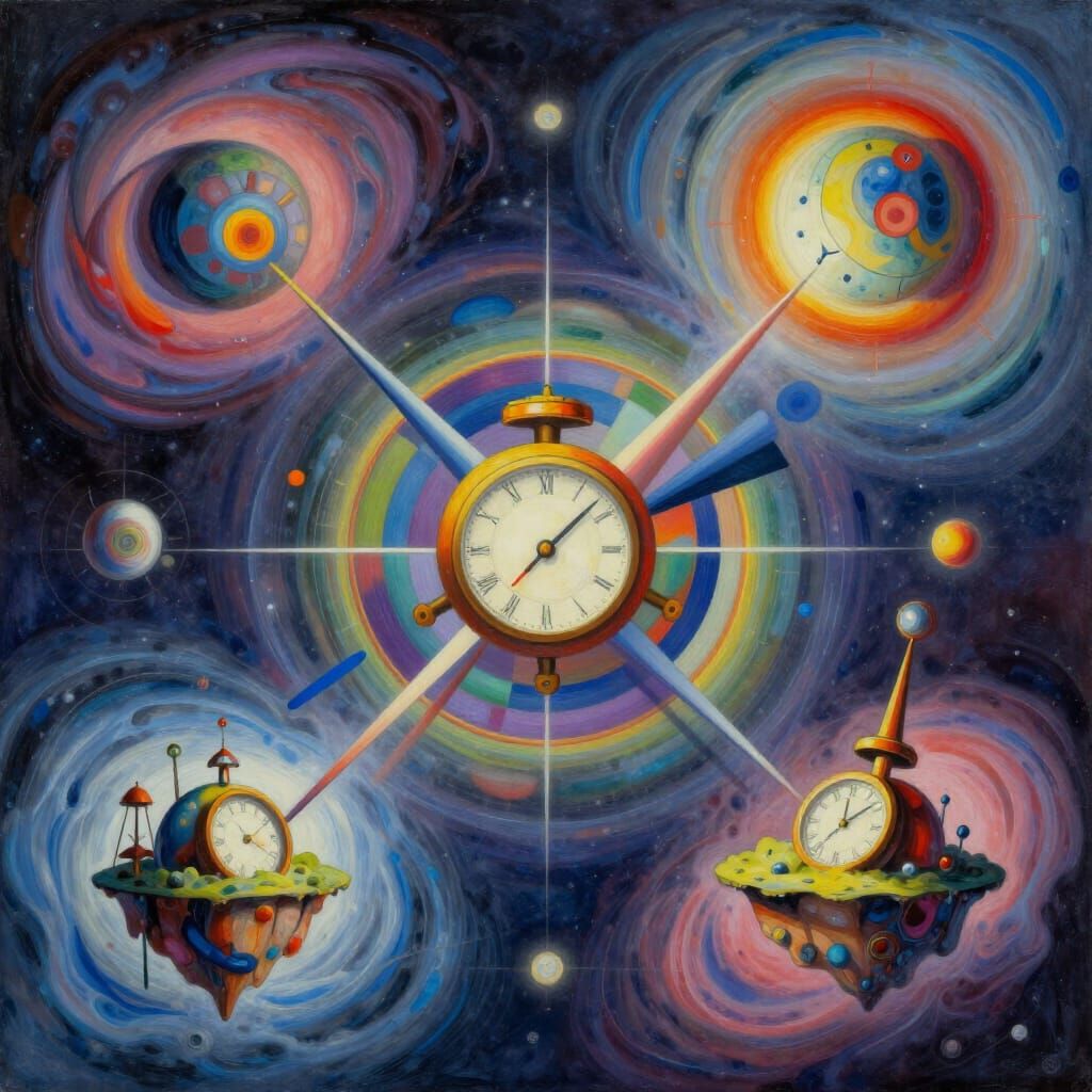 This image blends surreal dreamscapes with vibrant geometric patterns, featuring swirling nebulas, clockwork, and floating islands in a digital painting style with ethereal lighting.