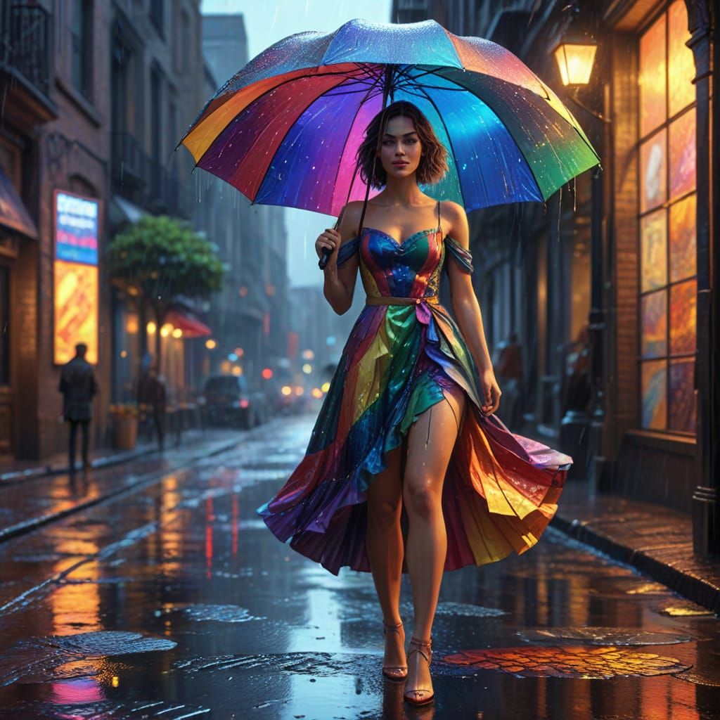 Easily generate your own images of women in rainbow dresses with umbrellas on rainy days. Free and simple!