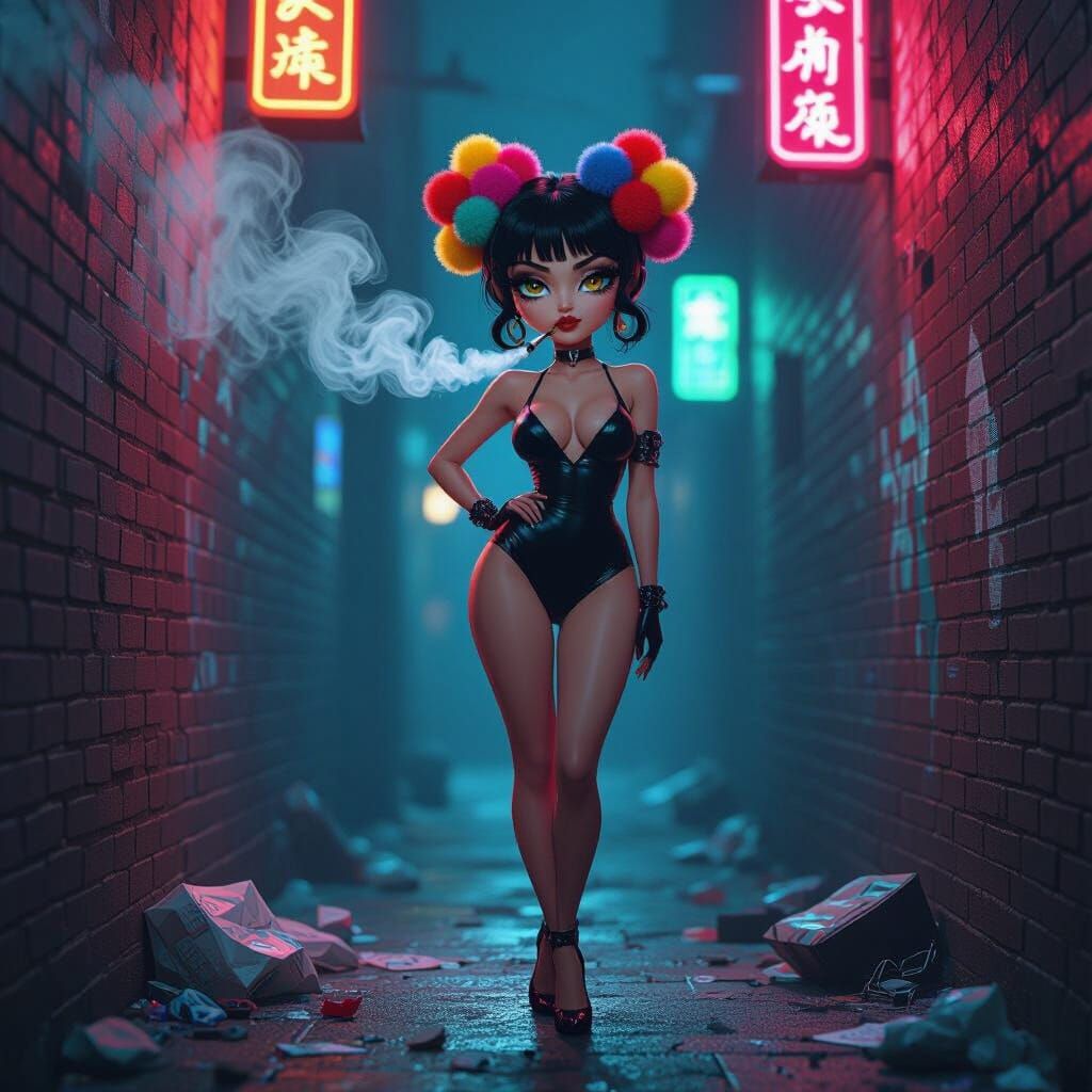 This image shows a mysterious pom-pom woman smoking in a dark alley at night. The vibrant 3D illustration features bold, geometric shapes and highly saturated colors in a playful digital art style.