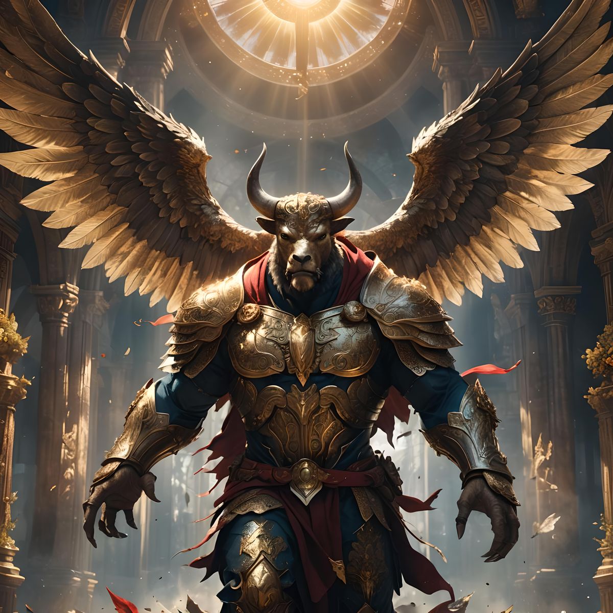 A digital painting of a winged bull bathed in divine light. The artwork features rich colors and intricate details, reminiscent of trending fantasy art.