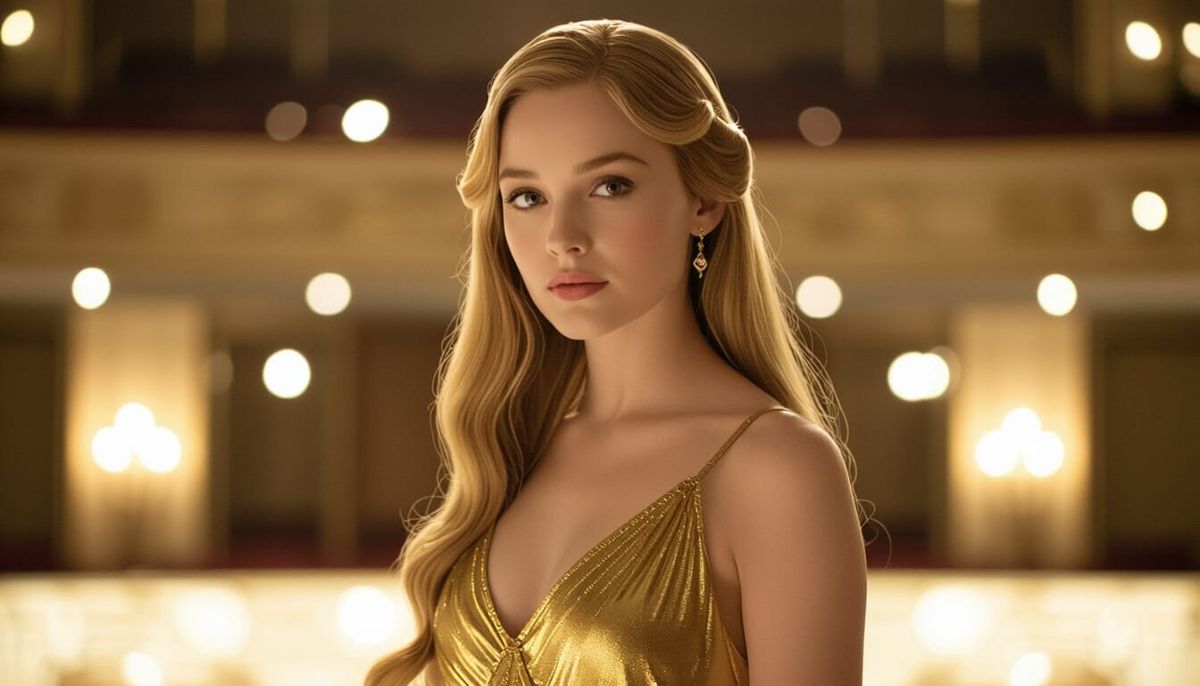 This image shows a blonde woman in a golden dress inside an old movie theater. The medium shot and dim lighting create a glamorous, vintage aesthetic.
