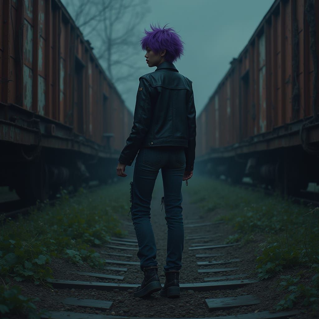 This image shows a young Asian woman with purple hair and a punk haircut in an abandoned railyard. She is wearing casual clothes and the image has a hyper-realistic style with intricate textures and atmospheric lighting.