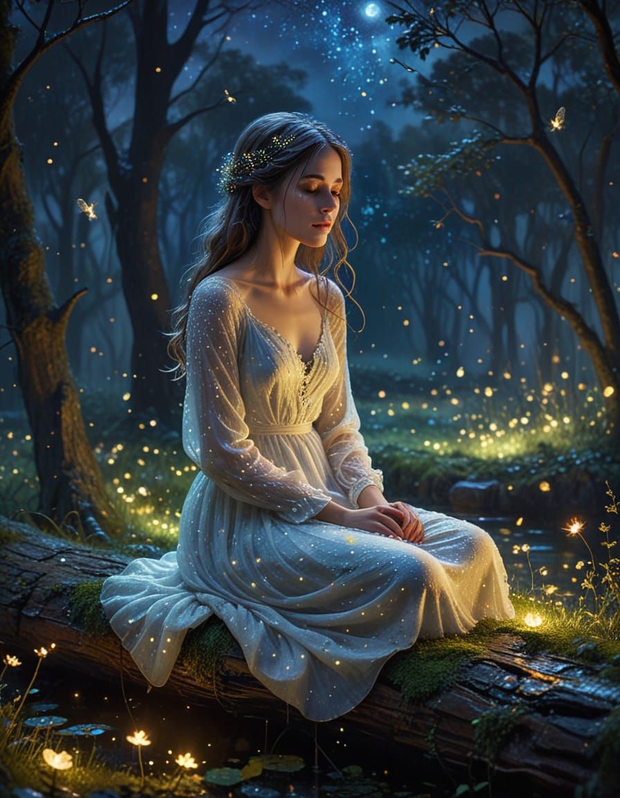 A beautiful ethereal girl in a flowing white dress sits on a mossy log under a starry night. Fireflies create a golden glow in this neo-impressionist fantasy art.