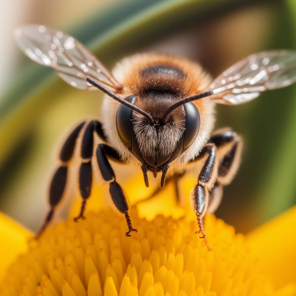 A striking photograph of a bee hovering near a vibrant yellow flower, capturing the intricate details of its wings and the intimate connection with the viewer.