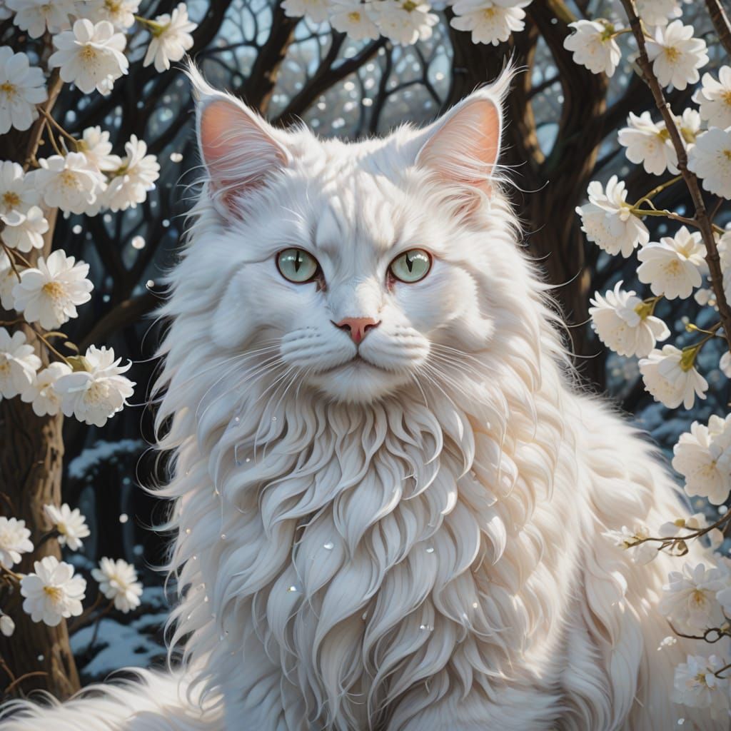 This enchanting oil painting depicts a delicate Angora fairy cat with mother-of-pearl white wings, set against a serene backdrop of snow-white silk waves and a flowering tree, all bathed in soft, shimmering white light.