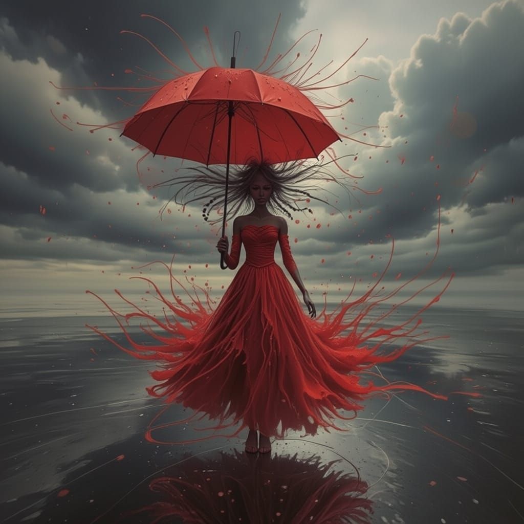 A striking picture of a faceless figure in a vibrant red dress holding a matching umbrella on a rain-slicked surface. Above, stormy clouds swirl in shades of gray and blue, creating a cinematic and ethereal atmosphere.