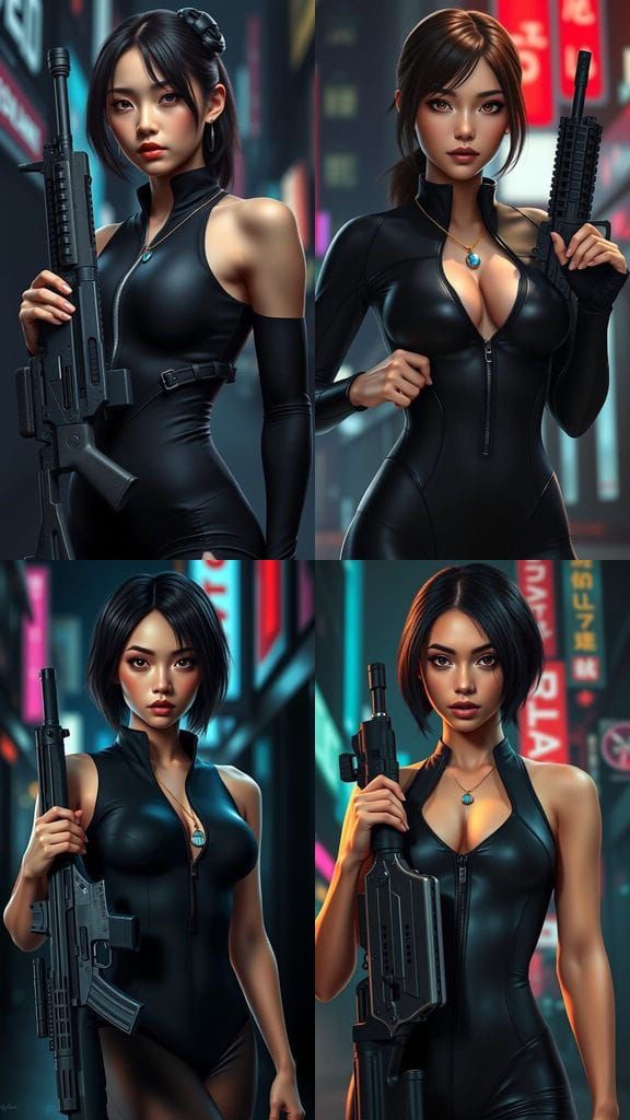 A striking picture of a woman with cybernetic enhancements in a cyberpunk city. She wears a black bodysuit and holds a futuristic rifle, with a shell charm necklace adding elegance.