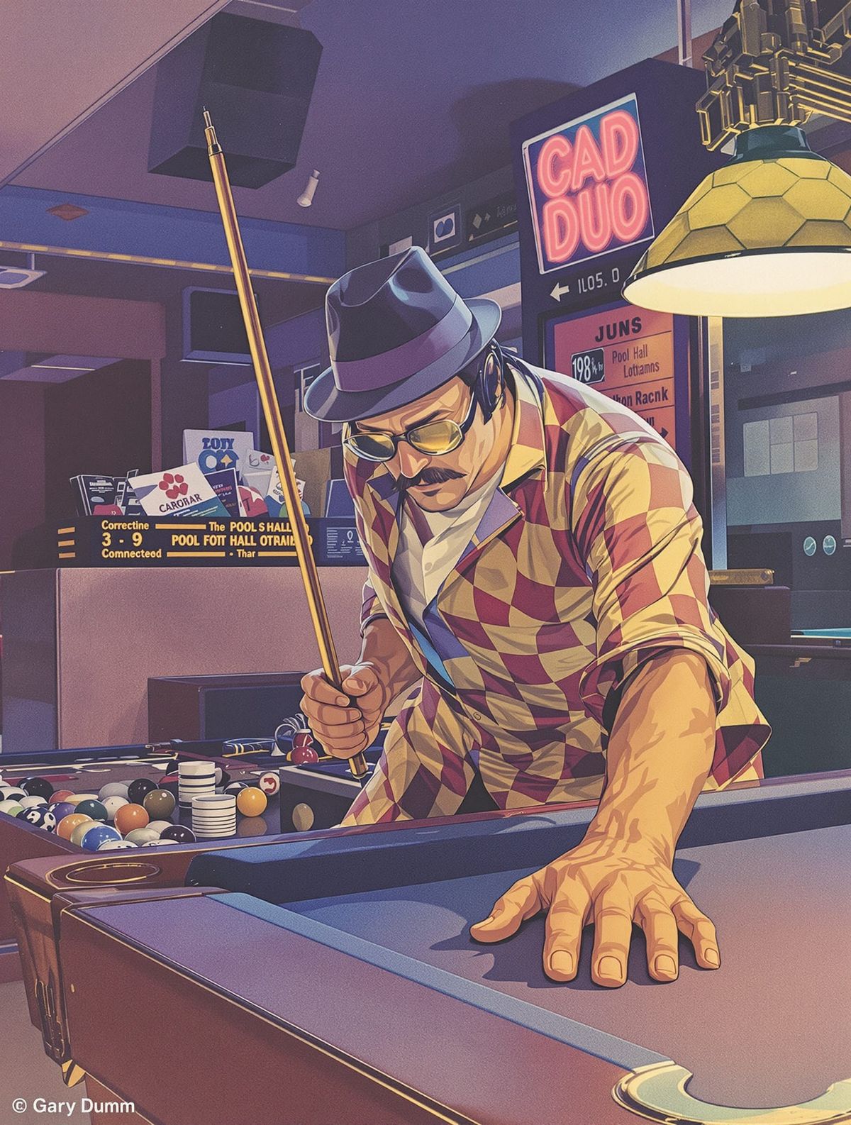 This image depicts a 1970s pool hall lothario, rendered with the distinctive illustrative style reminiscent of Gary Dumm's work, featuring bold lines and a gritty aesthetic.