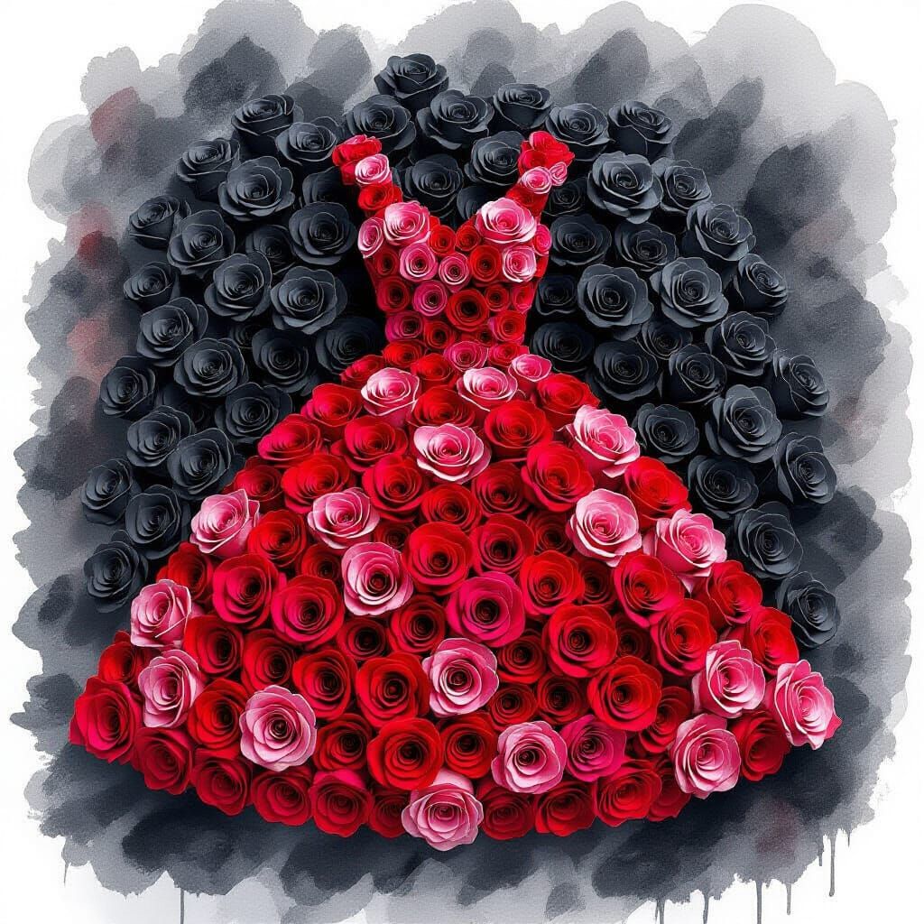 This image showcases a unique dress meticulously crafted from red roses, artfully arranged upon a bed of black roses, rendered in a fluid watercolor style.