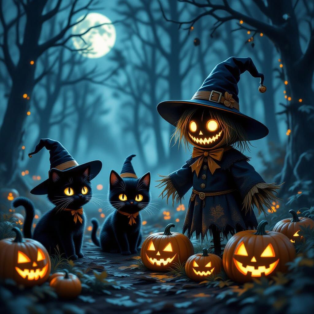 This dark fantasy illustration features adorable black cats in witch hats exploring a mystical, rune-lit pumpkin forest under eerie moonlight, rendered in a charcoal and gold leaf style.
