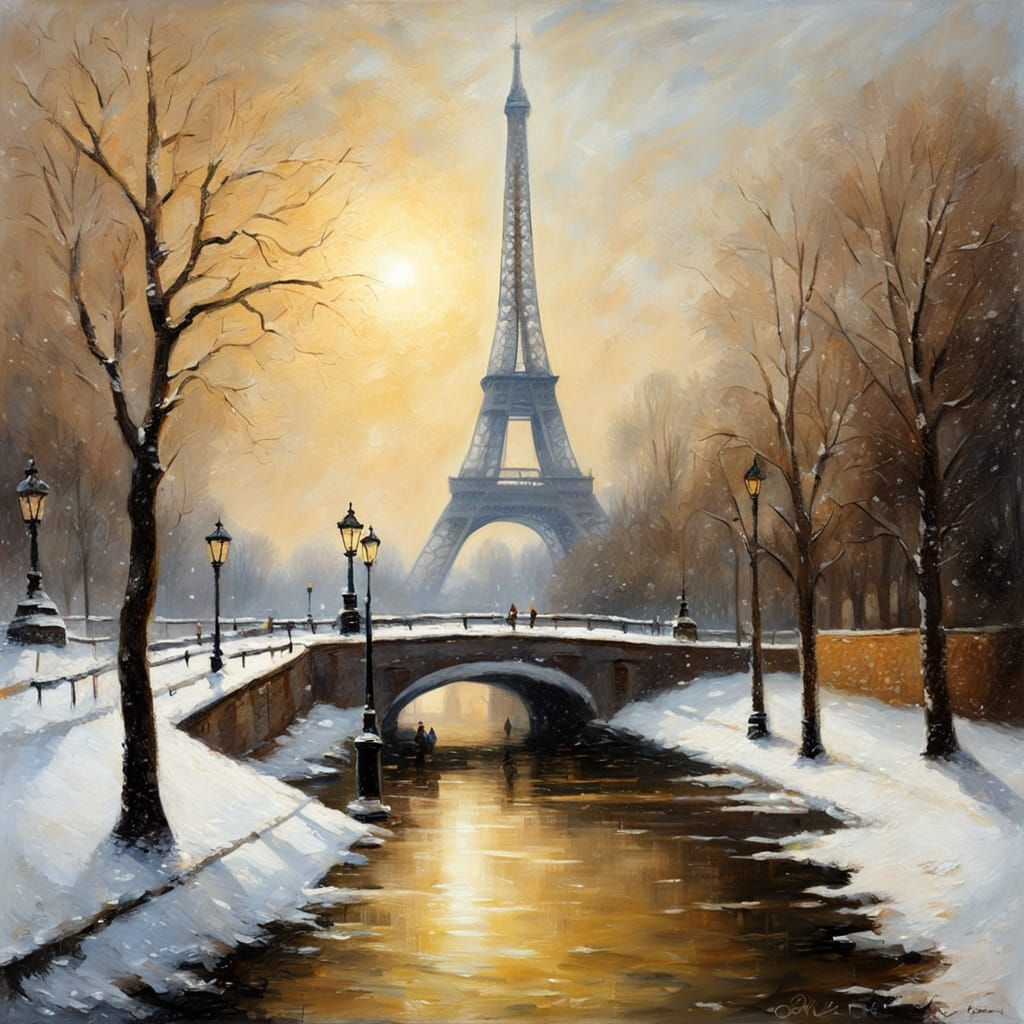 A snow-covered Eiffel Tower in a wintery Paris scene. The image evokes the Dutch Golden Age style, with soft, diffused light, oil painting textures and intricate portrait details.