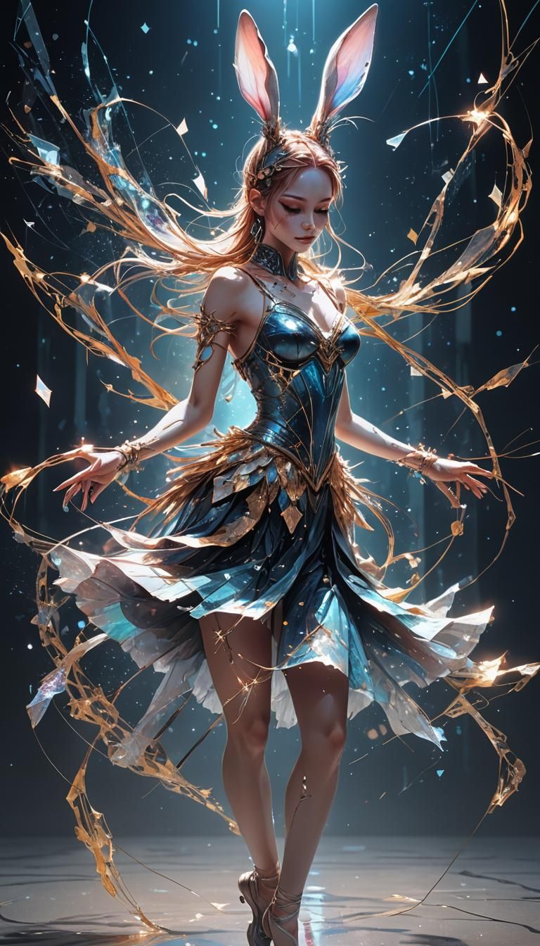 A digital painting of a cybernetic rabbit girl performing ballet in the moonlight. The artwork features crystals and stars, rendered with dynamic lighting and intricate details in a hyperrealistic fantasy style.