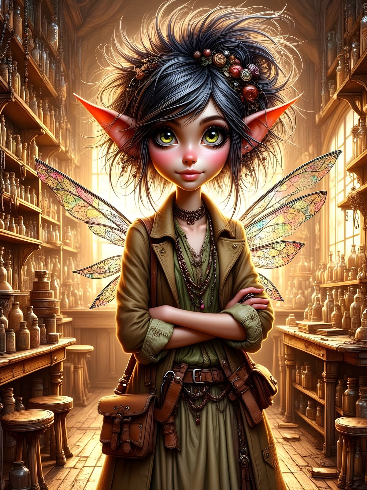 This image shows a fairy in her workshop, covered in grease from her tinkering work. The fairy has wings and is wearing full work gear, in a punk pixie aesthetic.