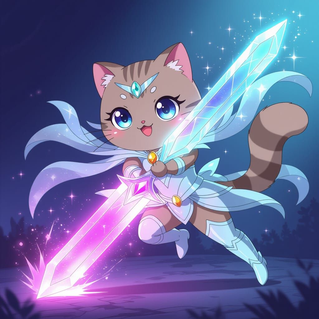 This image shows an ethereal cartoon Pusheen in a shimmering silver magical girl costume, charging into battle with a crystal sword glowing with cosmic energy. Rendered in a vibrant anime style with dynamic, cinematic lighting.