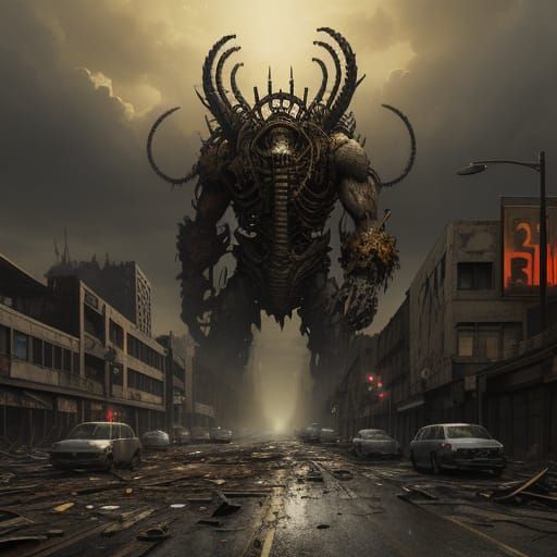 This image depicts a colossal creature amidst a devastated cityscape, crafted with thick brushstrokes and vivid colors in a Baroque style, evoking a sense of apocalyptic atmosphere and dark fantasy.