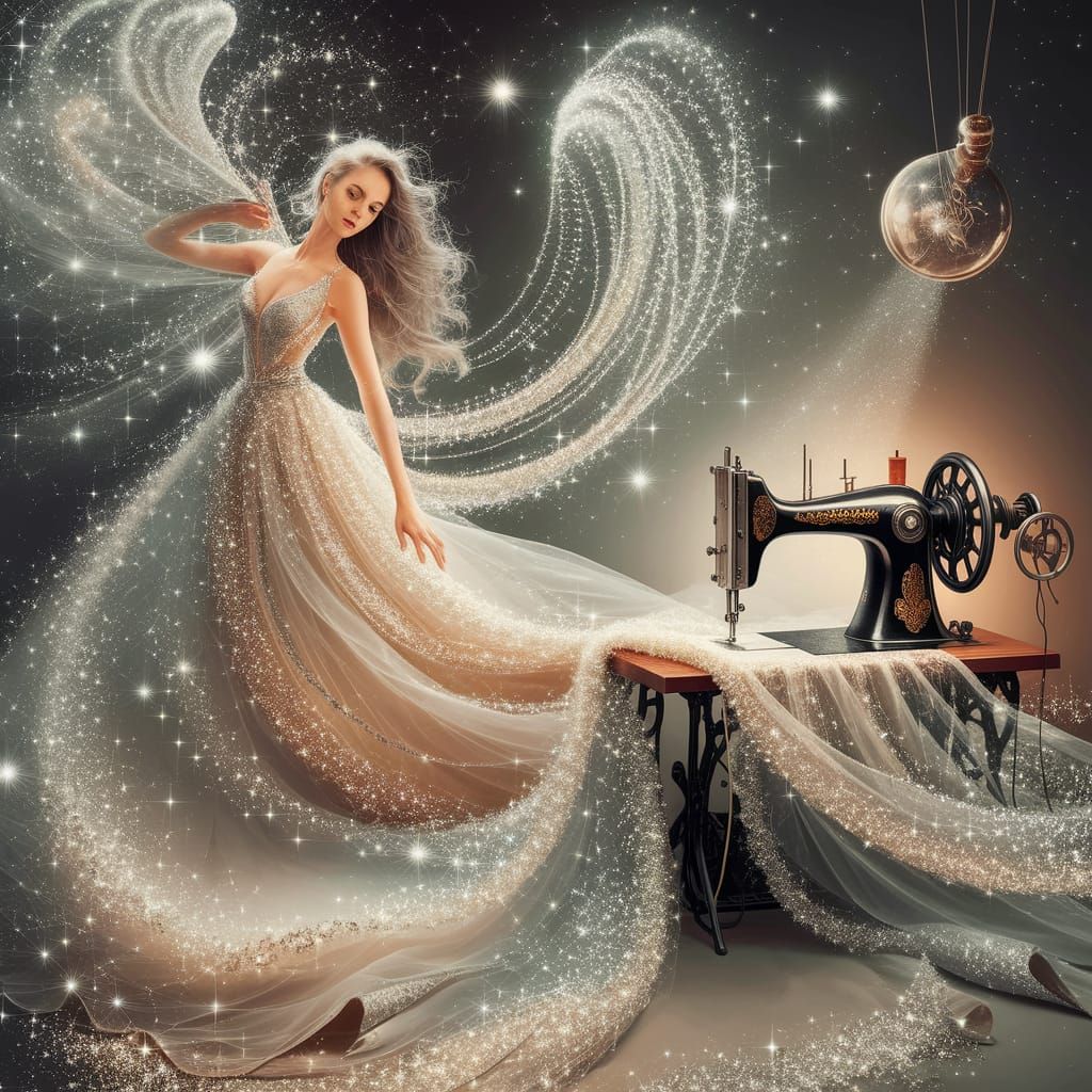 This image shows a vintage sewing machine magically creating a shimmering sequin dress, with stardust and glitter, in a dreamlike, softly rendered style.