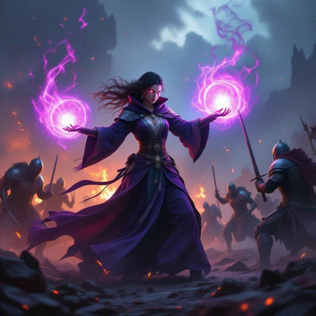 This image shows a sorceress in mystical robes unleashing elemental magic on a chaotic battlefield. The vivid colors and intense lighting create a highly detailed and dramatic scene, reminiscent of concept art.
