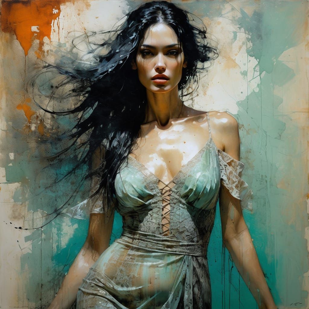 This oil painting captures a glamorous woman with long black hair and wet skin in a lace dress. It features flowing contours, soft focus, and ethereal paint application with luminous jade and burnt-orange tones.