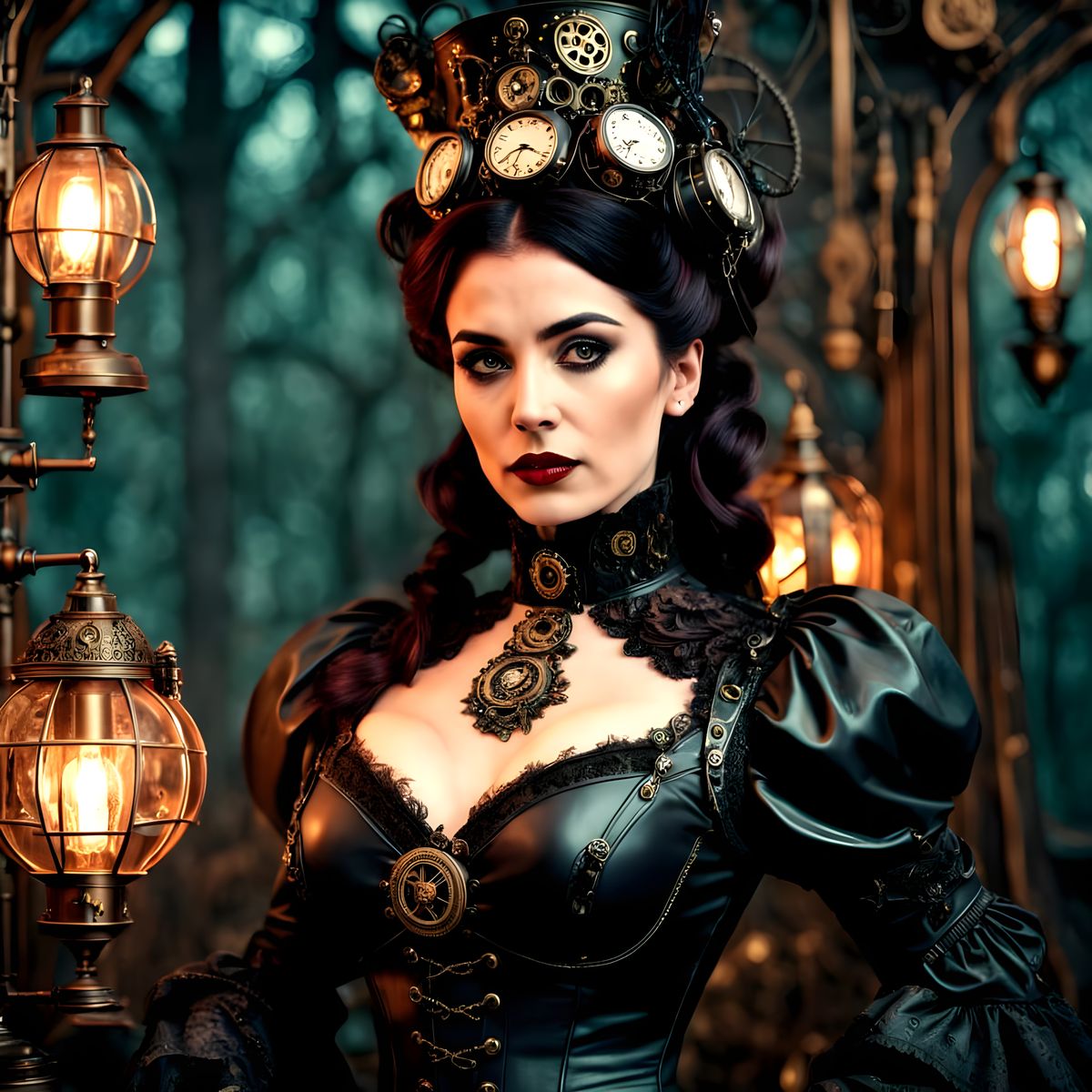 A digital image depicts a young, dark-haired woman in a goth steampunk-inspired Queen Victoria costume. The scene is set in a woodsy club, reminiscent of 1980s aesthetics.