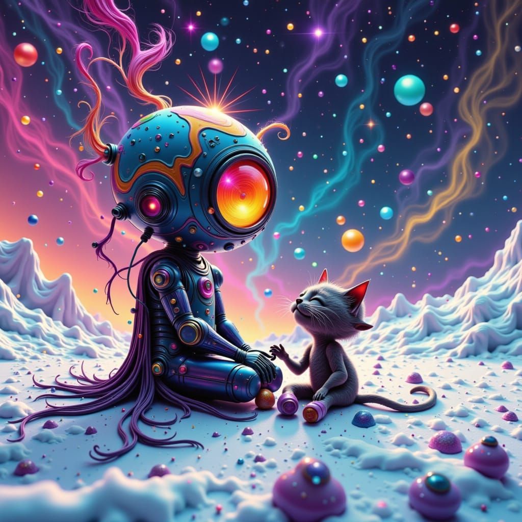 This image shows a grungy robot and a kitty sitting together in a vibrant cosmic winter landscape. Swirling snow and stardust fill the scene in a celestialpunk style.