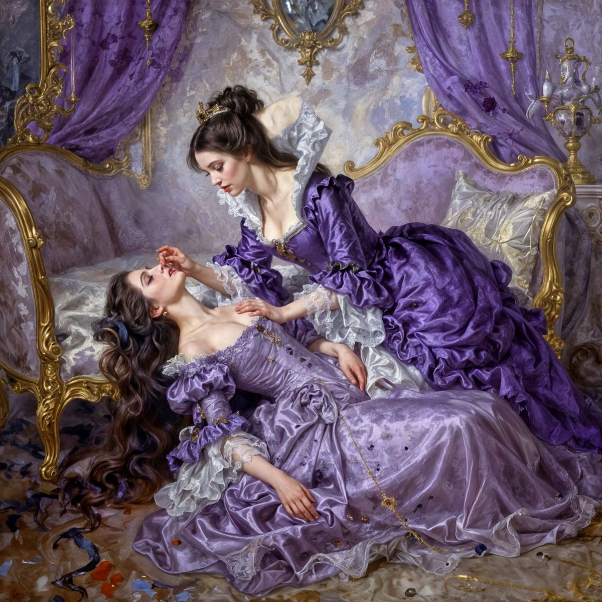 This oil painting captures a baroque female vampire kneeling over a victim in a lavish bedroom. The artwork features ink splashes and opulent purple hues.