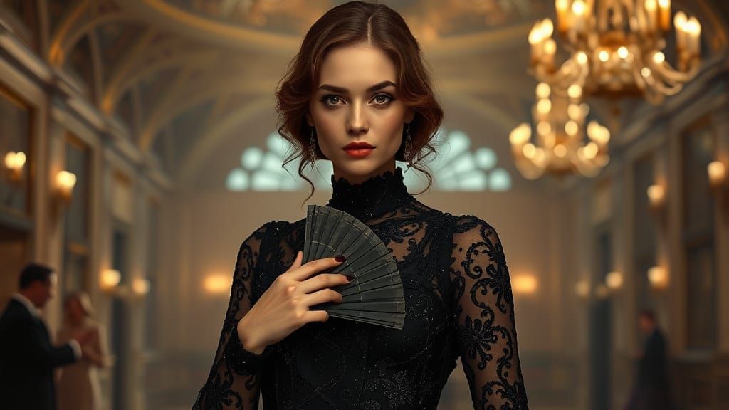 A striking picture of an Edwardian woman in a black gown holding a fan. The scene is set in a grand ballroom with dramatic lighting, reminiscent of art nouveau, rendered with hyperrealistic detail.