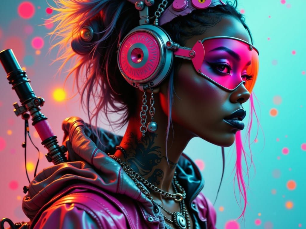 A close-up view of Jimin in a fairycore retro biker style, featuring unusual pastel colors, African patterns, and techwear elements with a neon light background.