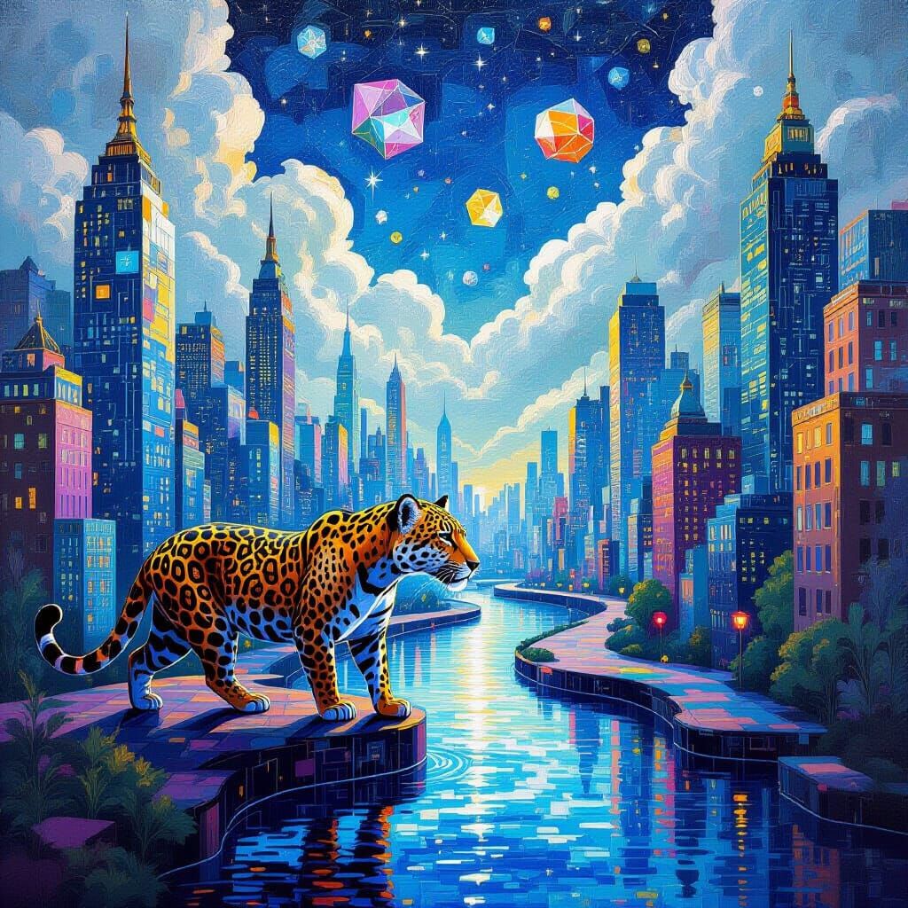 A striking picture of a jaguar with constellation patterns walking through a surreal city. Liquid light flows between buildings, reflecting geometric shapes in the sky, rendered in a neo-impressionistic style.