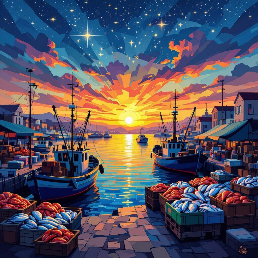 A vibrant image of a harbor at sunrise, filled with fishing boats and a busy fish market. The scene is rendered with cubist geometry and art deco patterns, in an angular, oil-painting-like style.