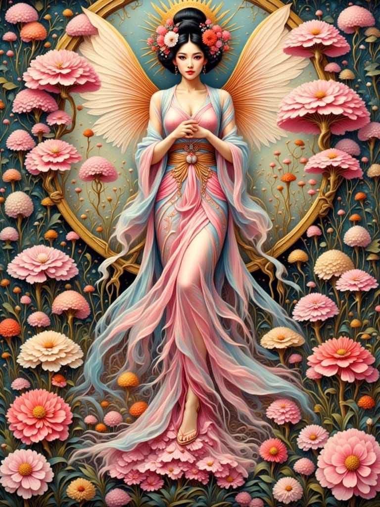 A vintage pin-up figure blends with Mondrian-inspired geometric patterns against a backdrop of cherry blossoms. This image evokes the style of classic ukiyo-e screen prints.