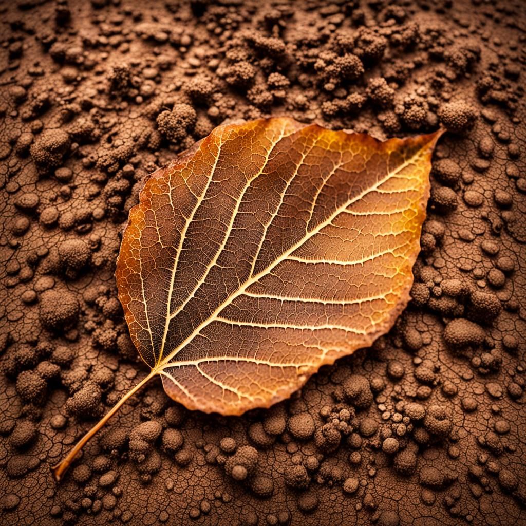 This image shows a macro shot of a brown autumn leaf on a forest floor. The leaf features intricate, swirling patterns reminiscent of the Art Nouveau period, with warm and earthy tones.